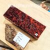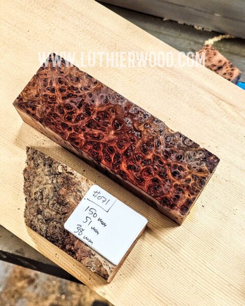 Fantastically unique knife scale or tool handle block. Photographed from both sides and sprayed with naphtha to give you an idea of how it will look when finished. Jarrah is a species of Australian Eucalyptus renowned for it’s hardness and beautiful, deep red colour. The Burls are very distinctive and great for many different wood working projects.