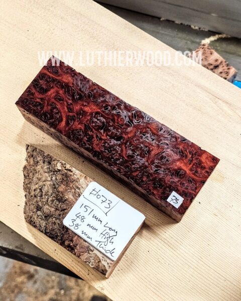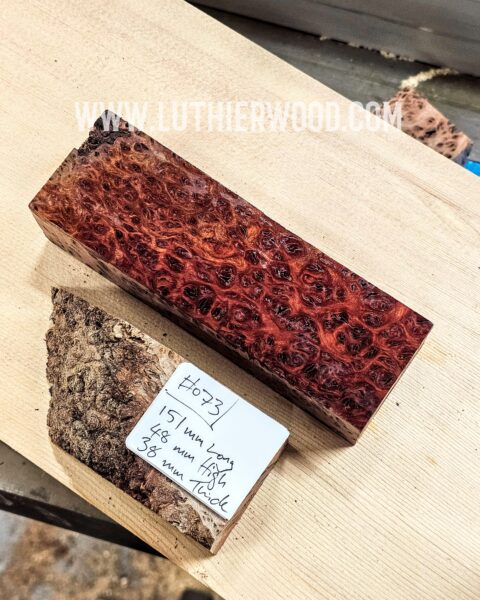 Fantastically unique knife scale or tool handle block. Photographed from both sides and sprayed with naphtha to give you an idea of how it will look when finished. Jarrah is a species of Australian Eucalyptus renowned for it’s hardness and beautiful, deep red colour. The Burls are very distinctive and great for many different wood working projects.
