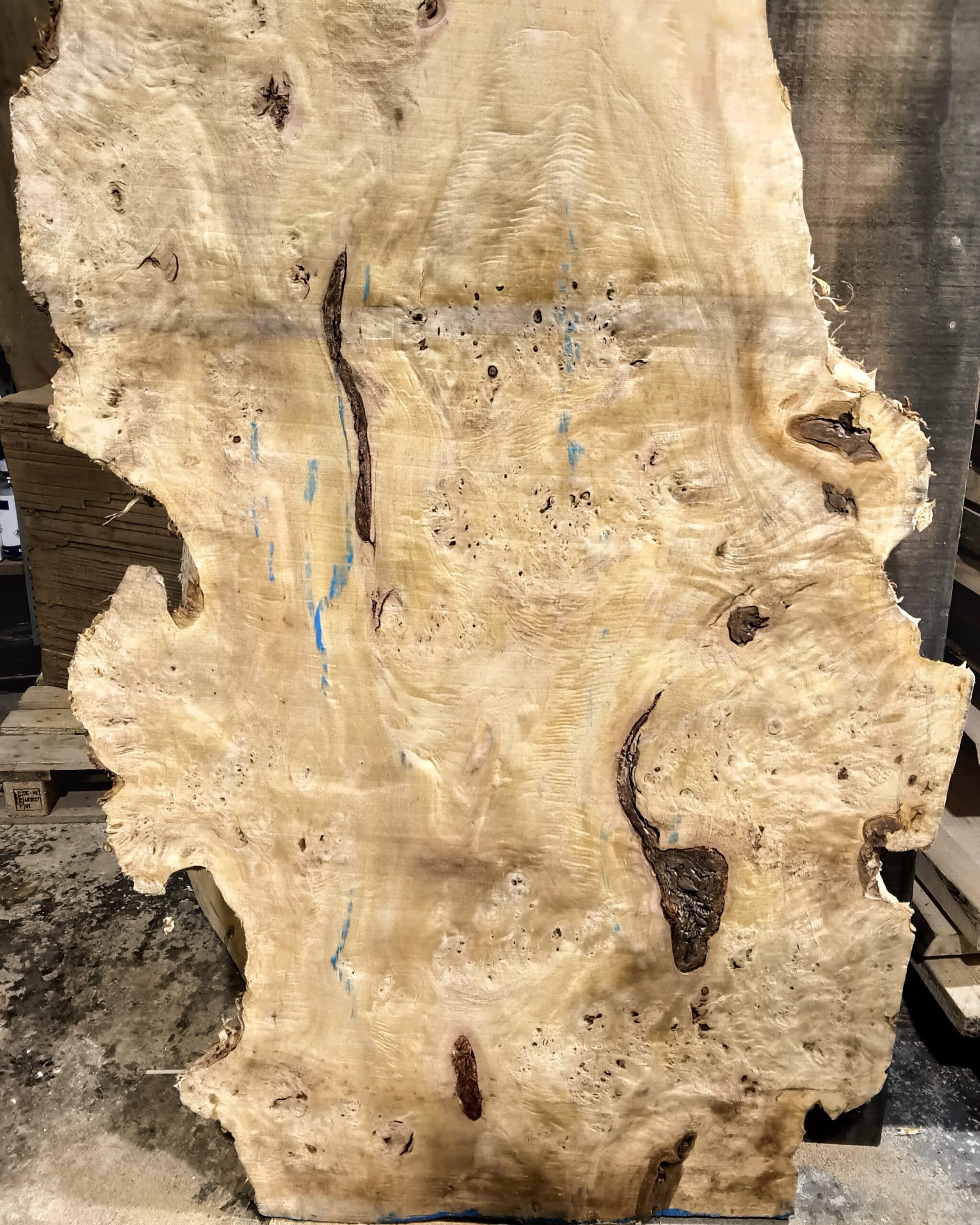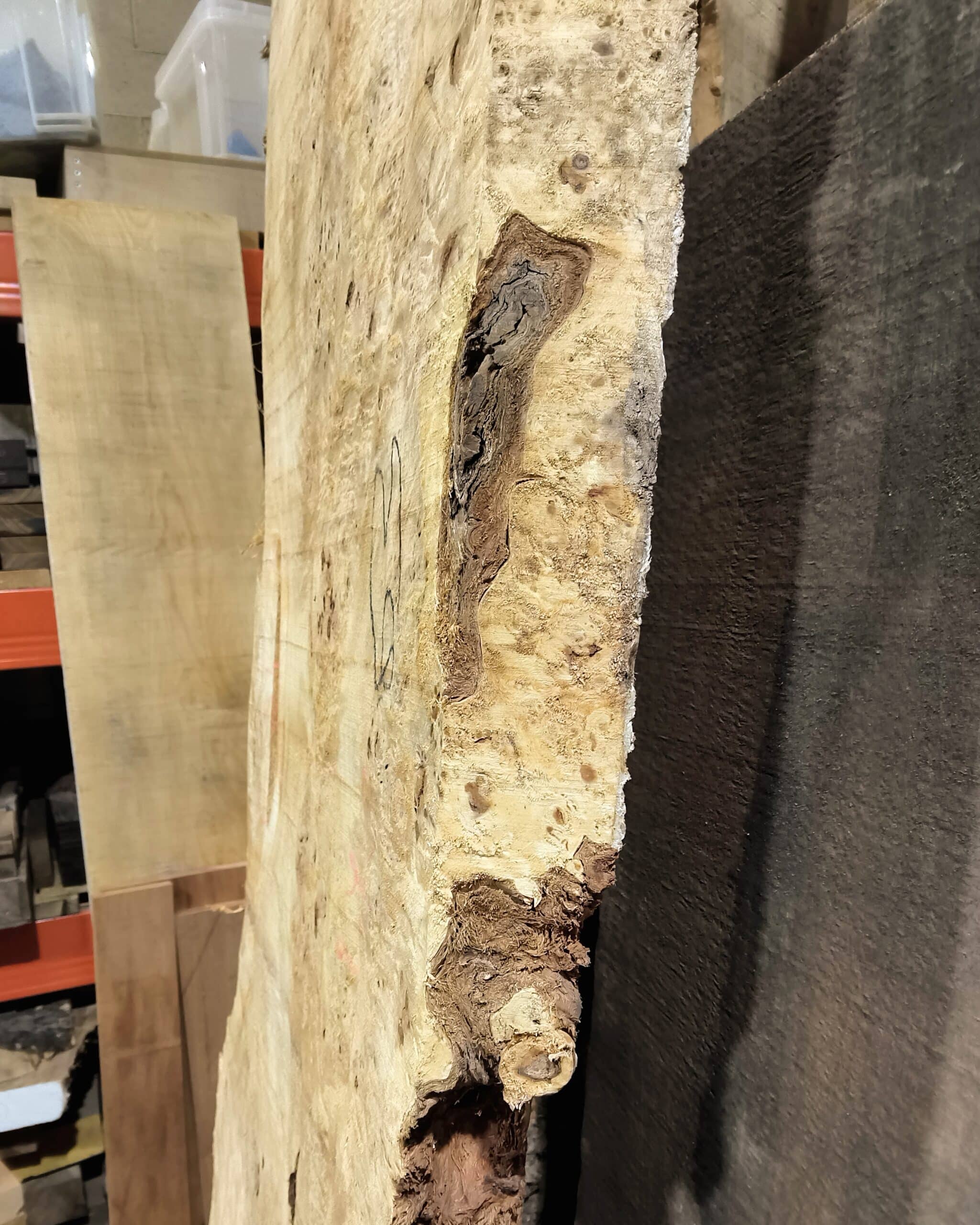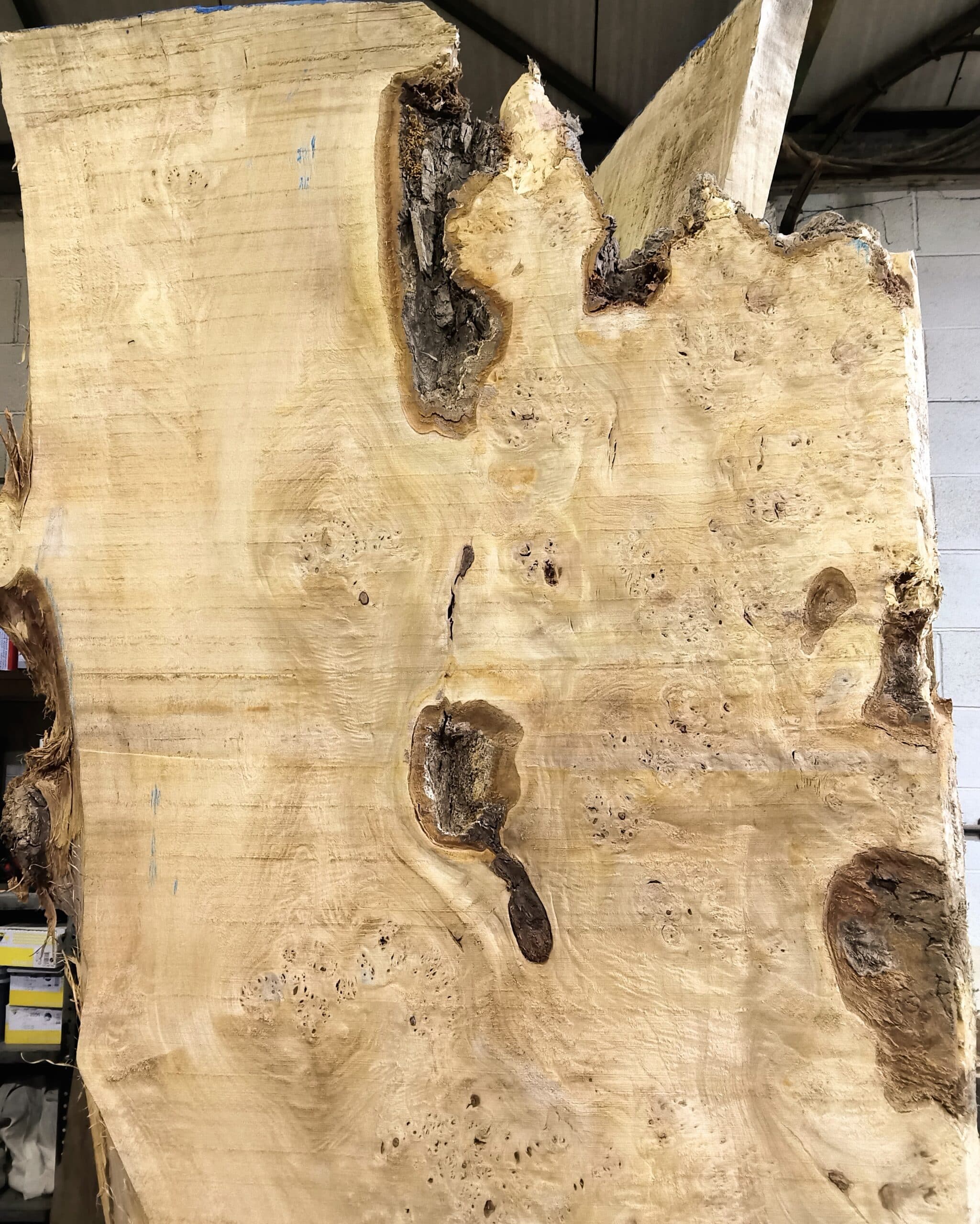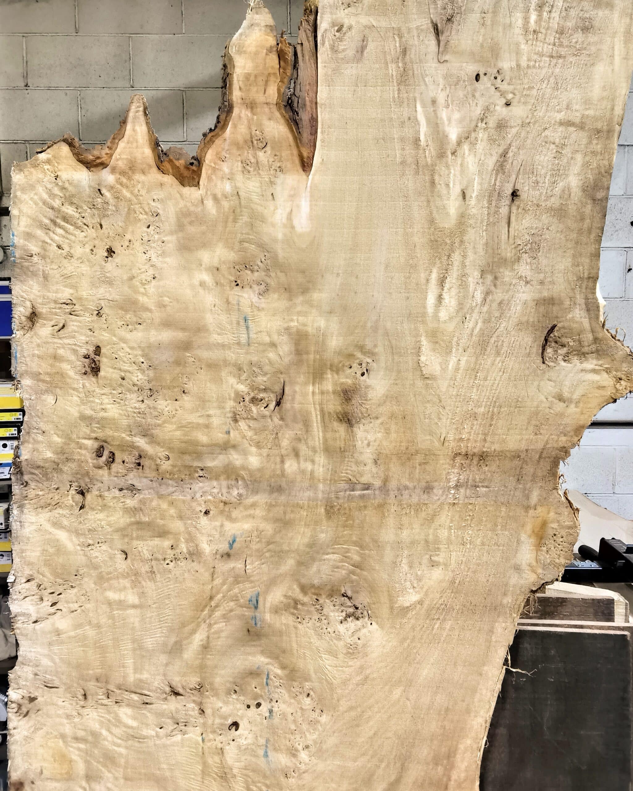 Huge Poplar Burl Slab with all the classic features, vivid flame, dark burl clusters and even some quilted areas. With great colouration and unique character throughout, Poplar Burl slabs of this quality and size are hard to find on UK soil. This slab features the classic dark burl eyes with creamy coloured heartwood and nice Ripple effect in places.