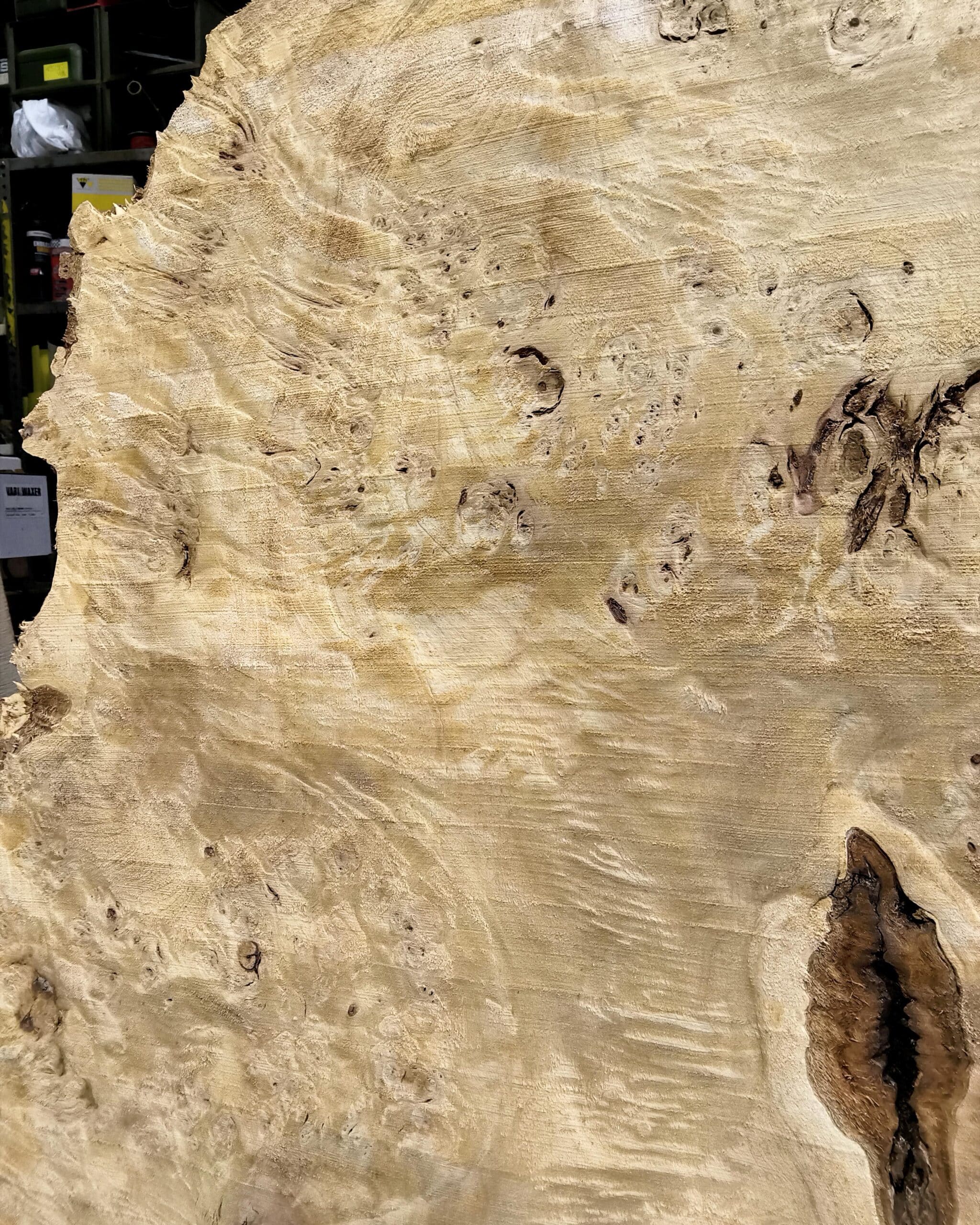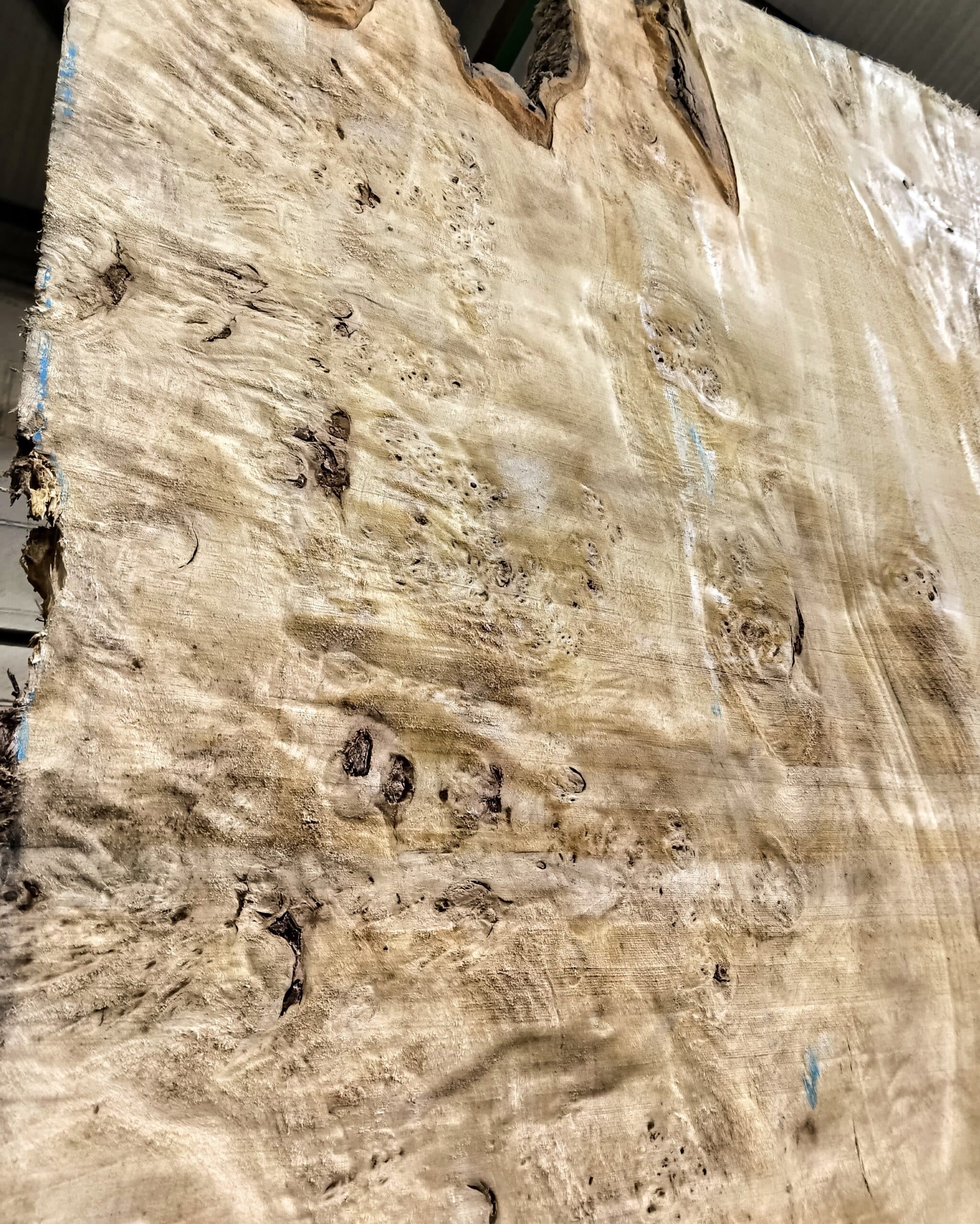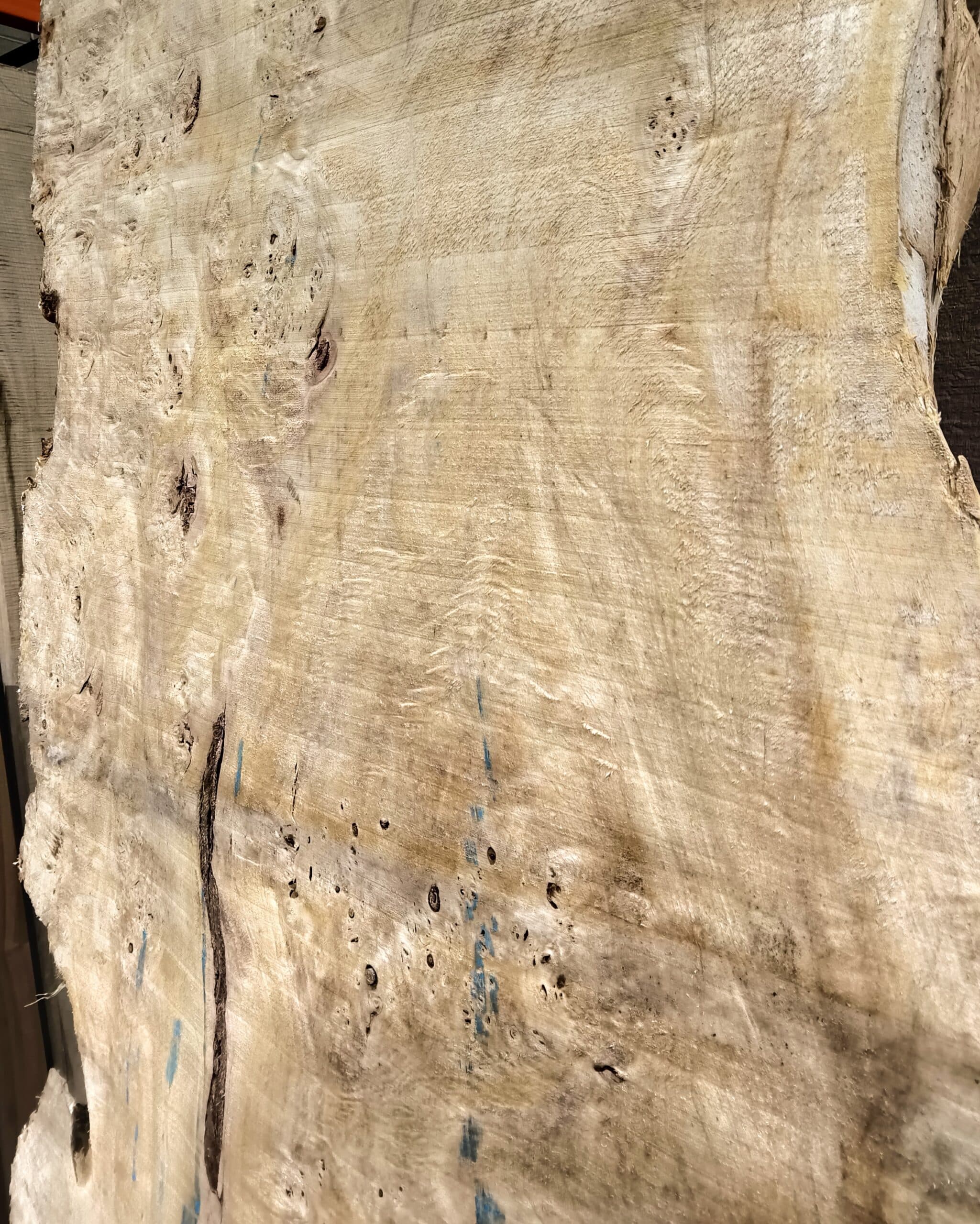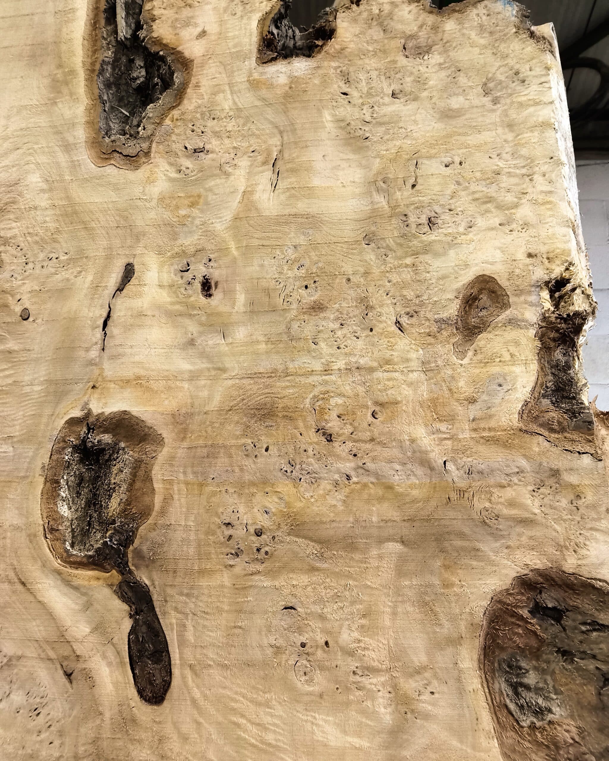 Huge Poplar Burl Slab with all the classic features, vivid flame, dark burl clusters and even some quilted areas. With great colouration and unique character throughout, Poplar Burl slabs of this quality and size are hard to find on UK soil. This slab features the classic dark burl eyes with creamy coloured heartwood and nice Ripple effect in places.