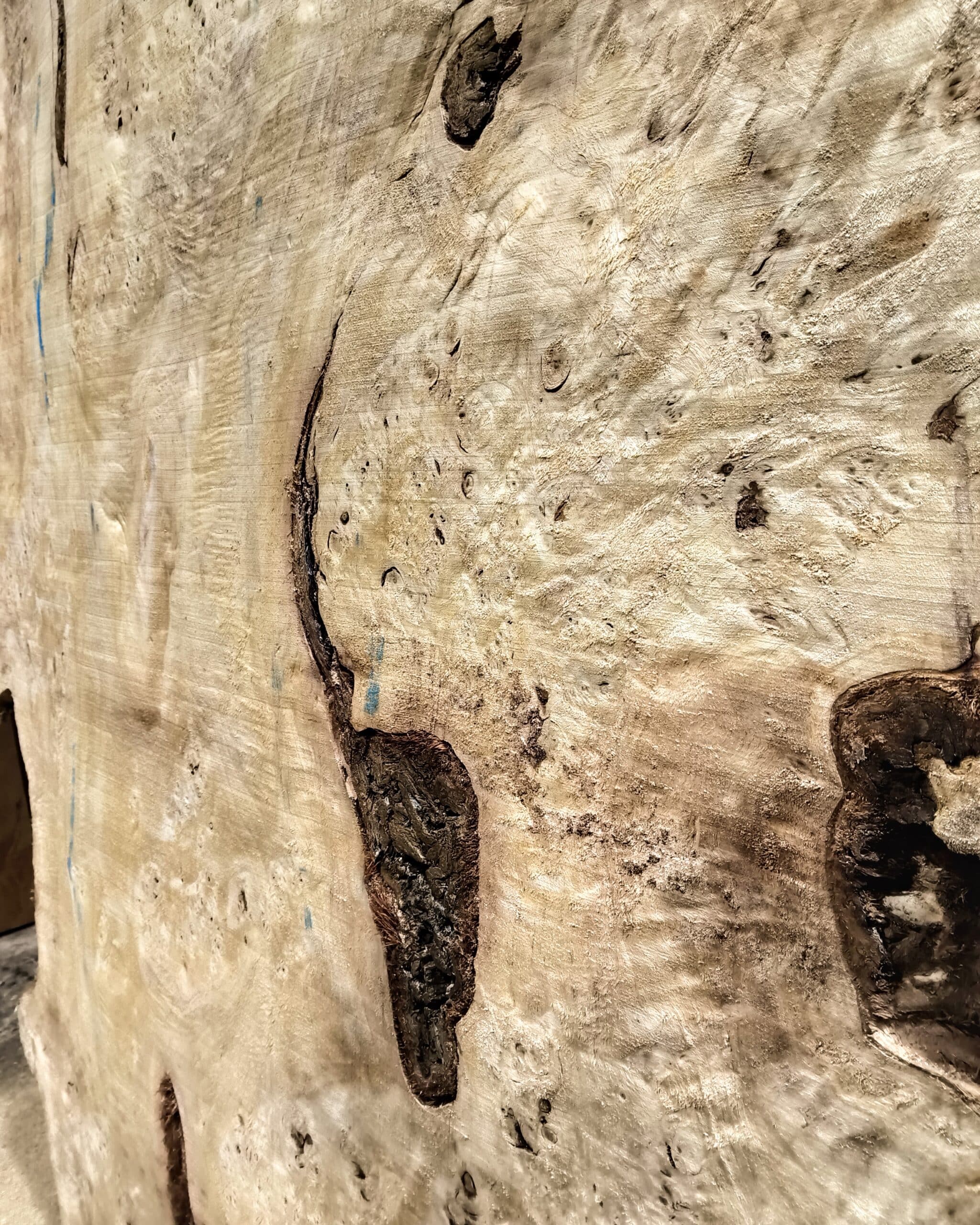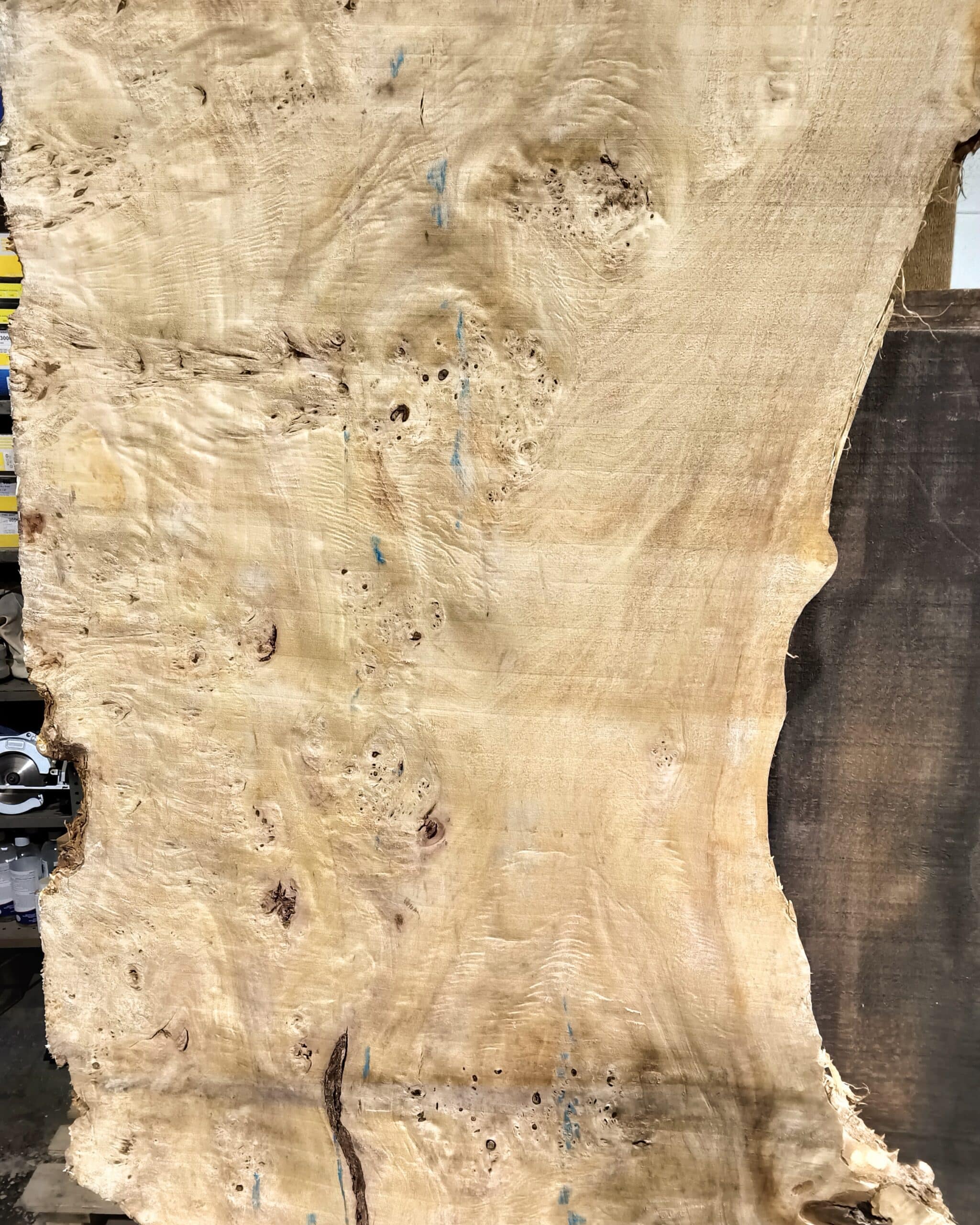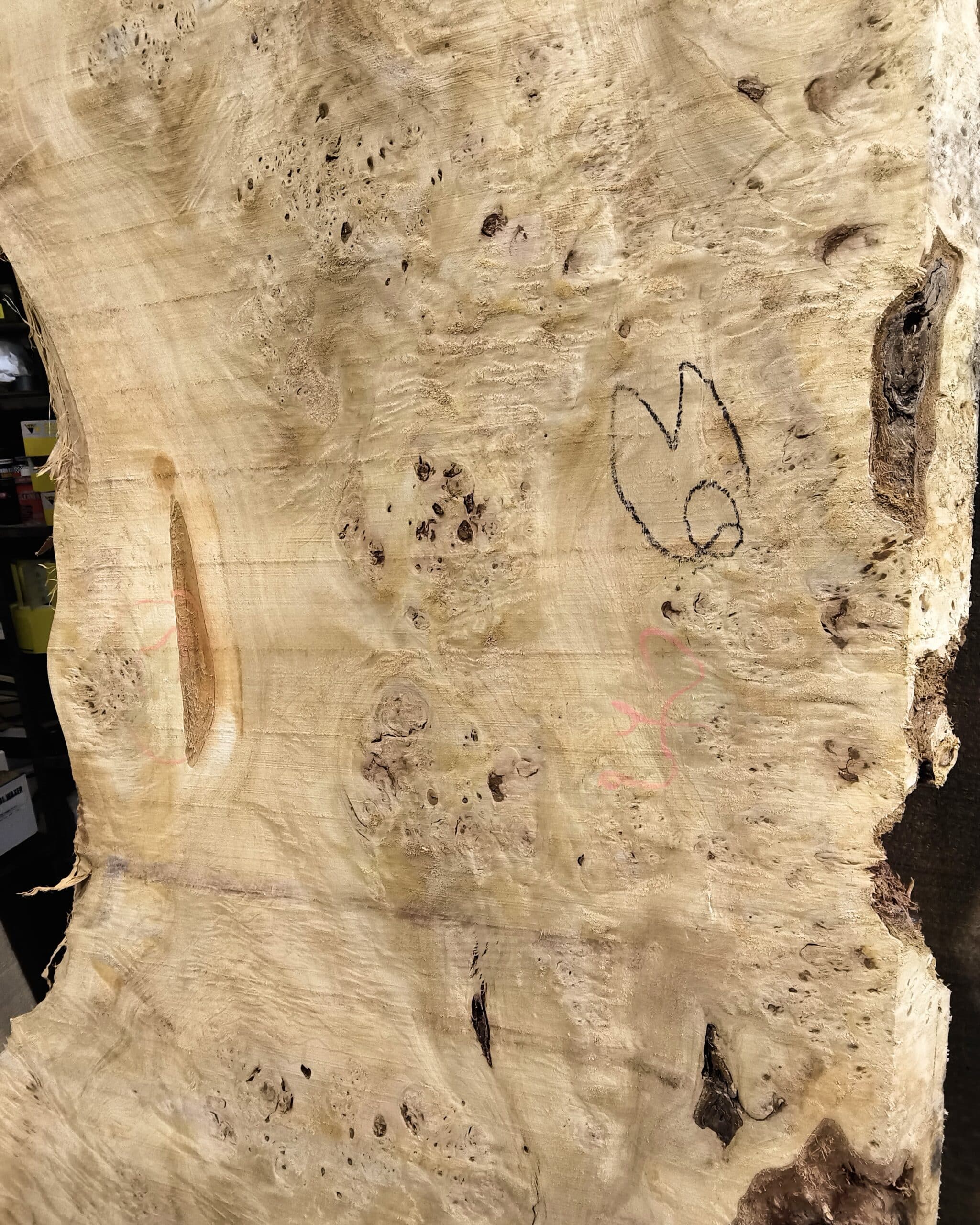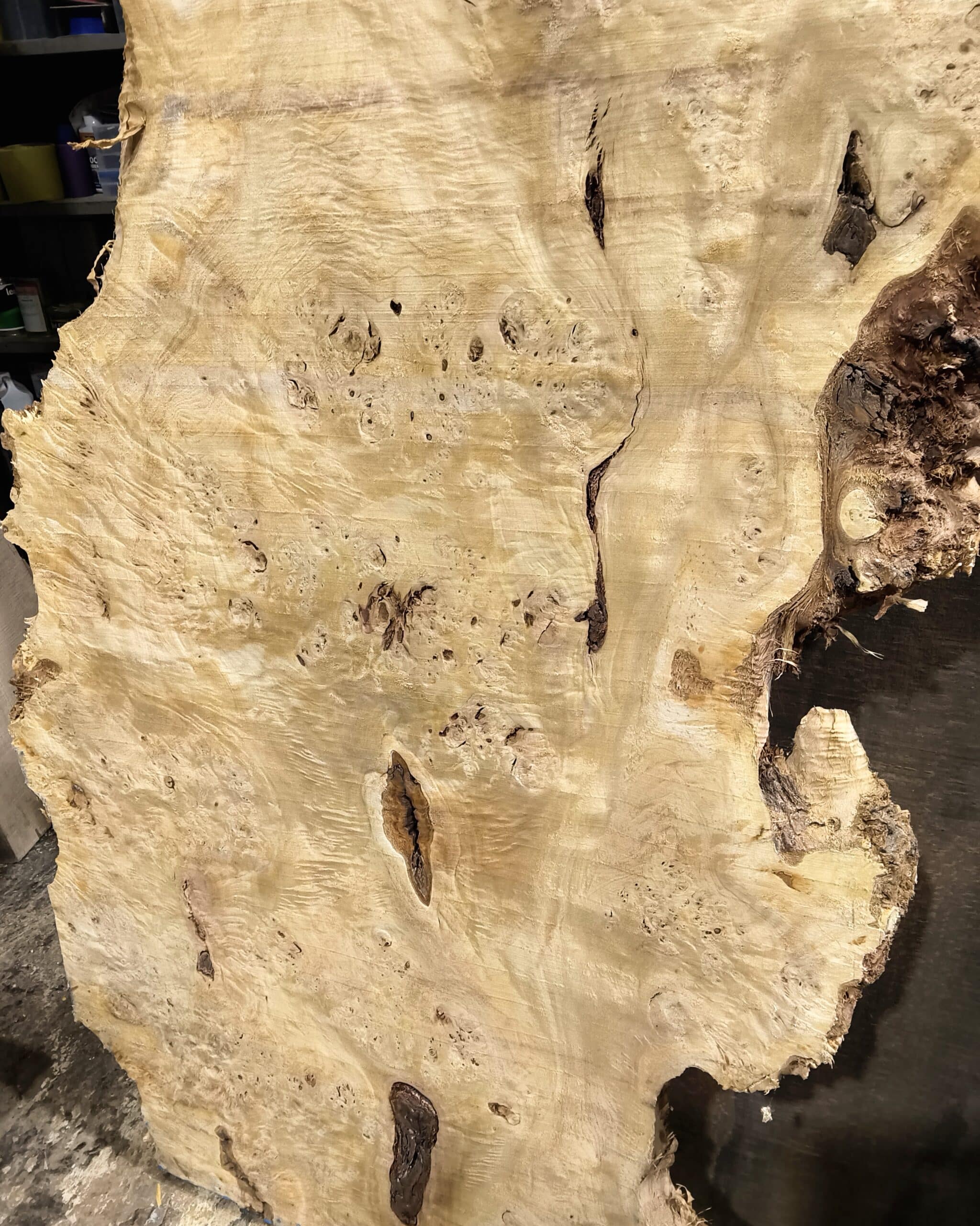 Huge Poplar Burl Slab with all the classic features, vivid flame, dark burl clusters and even some quilted areas. With great colouration and unique character throughout, Poplar Burl slabs of this quality and size are hard to find on UK soil. This slab features the classic dark burl eyes with creamy coloured heartwood and nice Ripple effect in places.