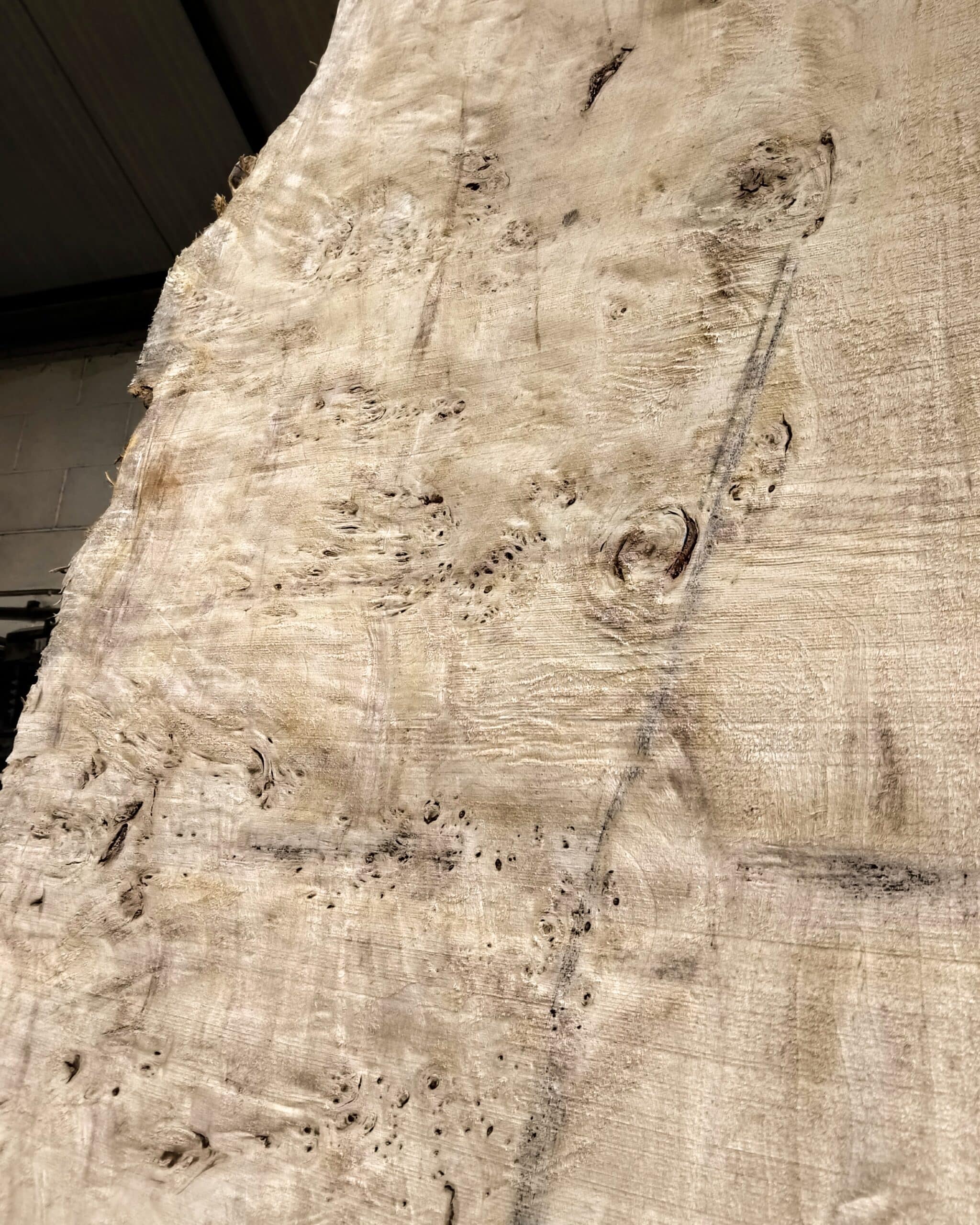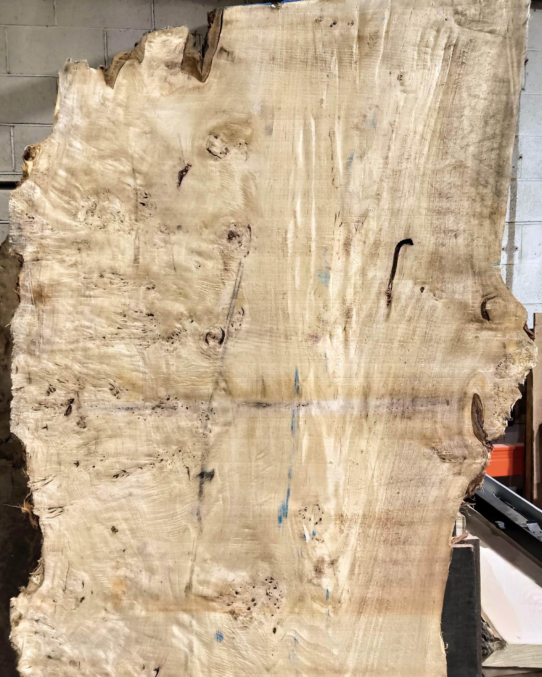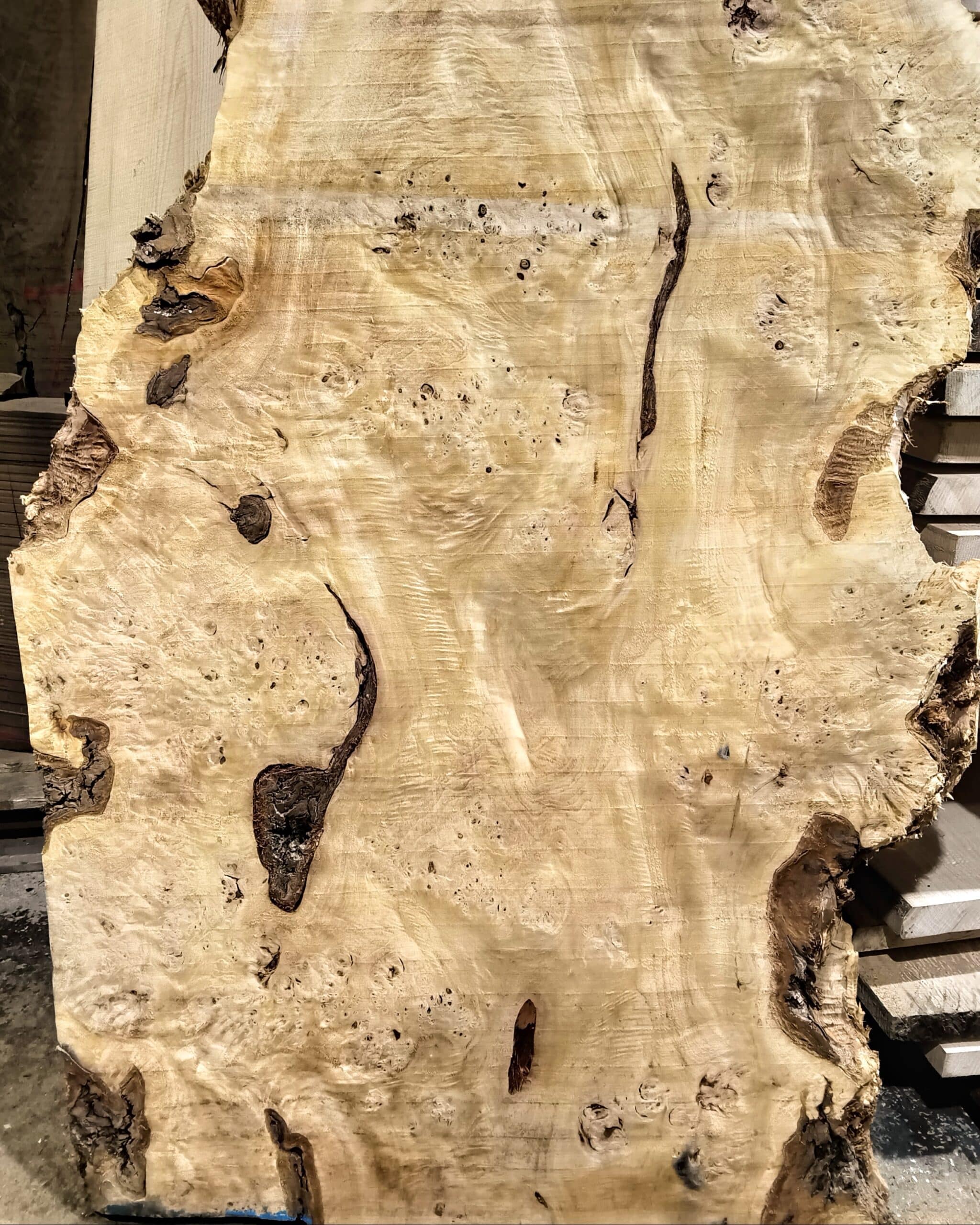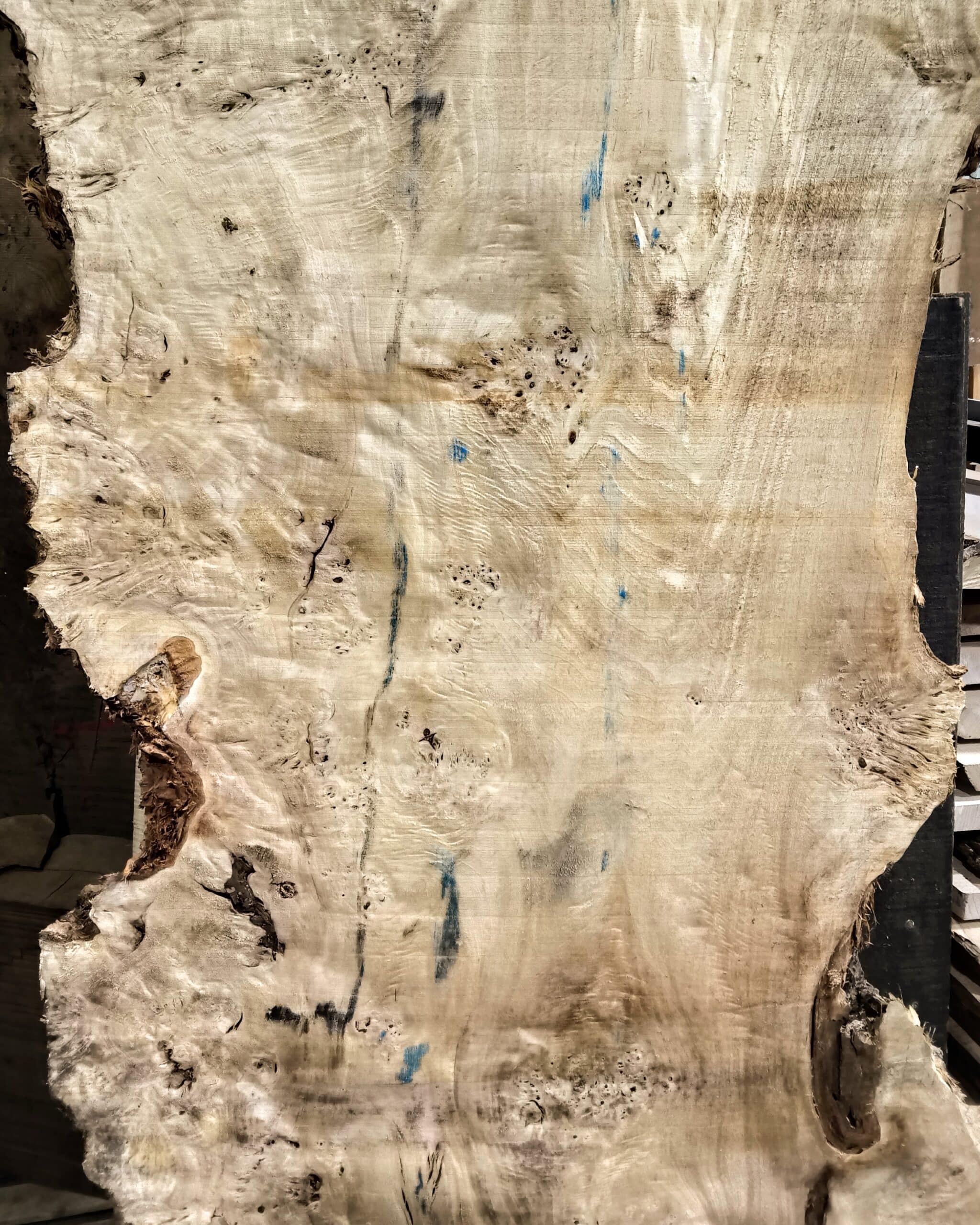 Huge Poplar Burl Slab with all the classic features, vivid flame, dark burl clusters and even some quilted areas. With great colouration and unique character throughout, Poplar Burl slabs of this quality and size are hard to find on UK soil. This slab features the classic dark burl eyes with creamy coloured heartwood and nice Ripple effect in places.