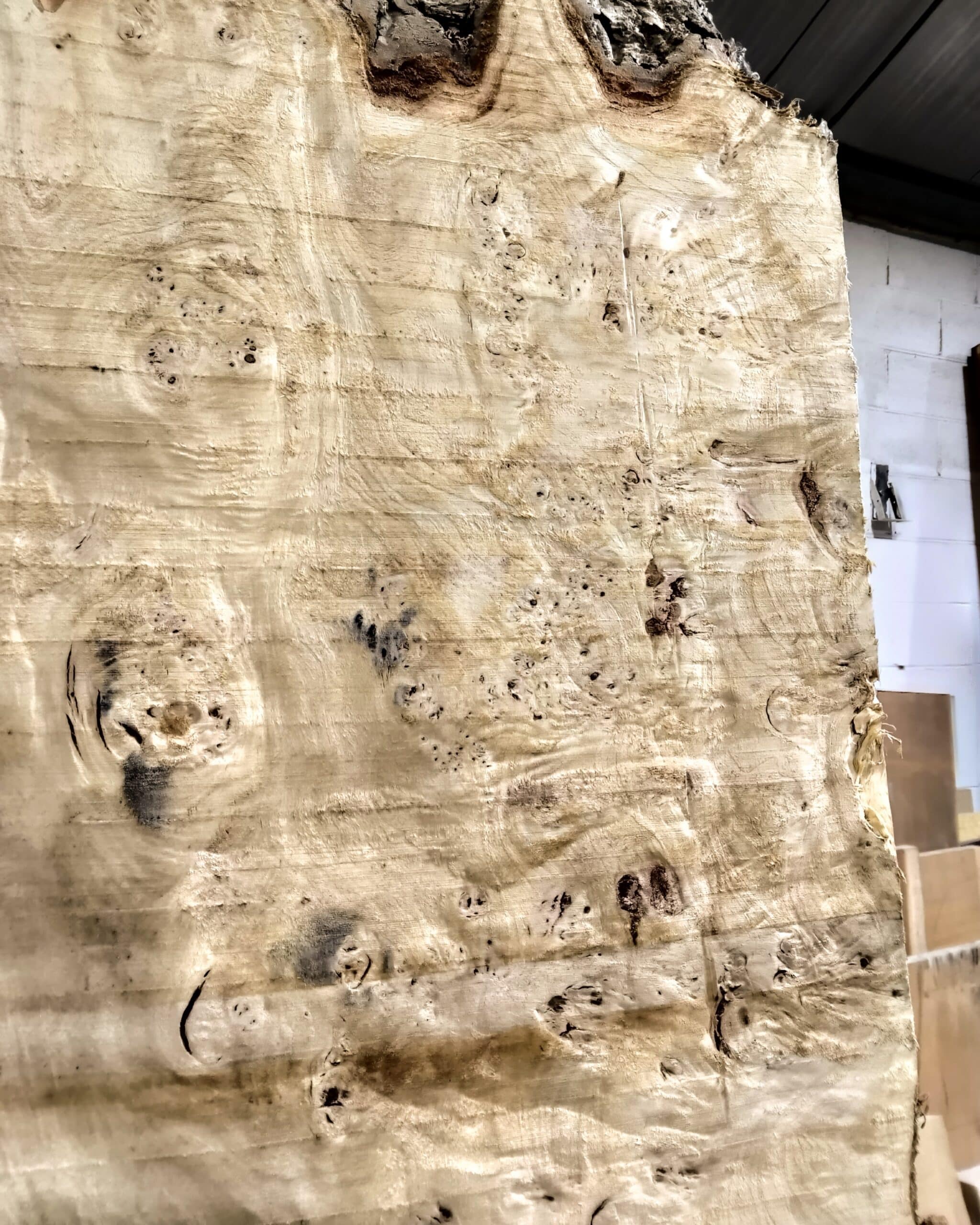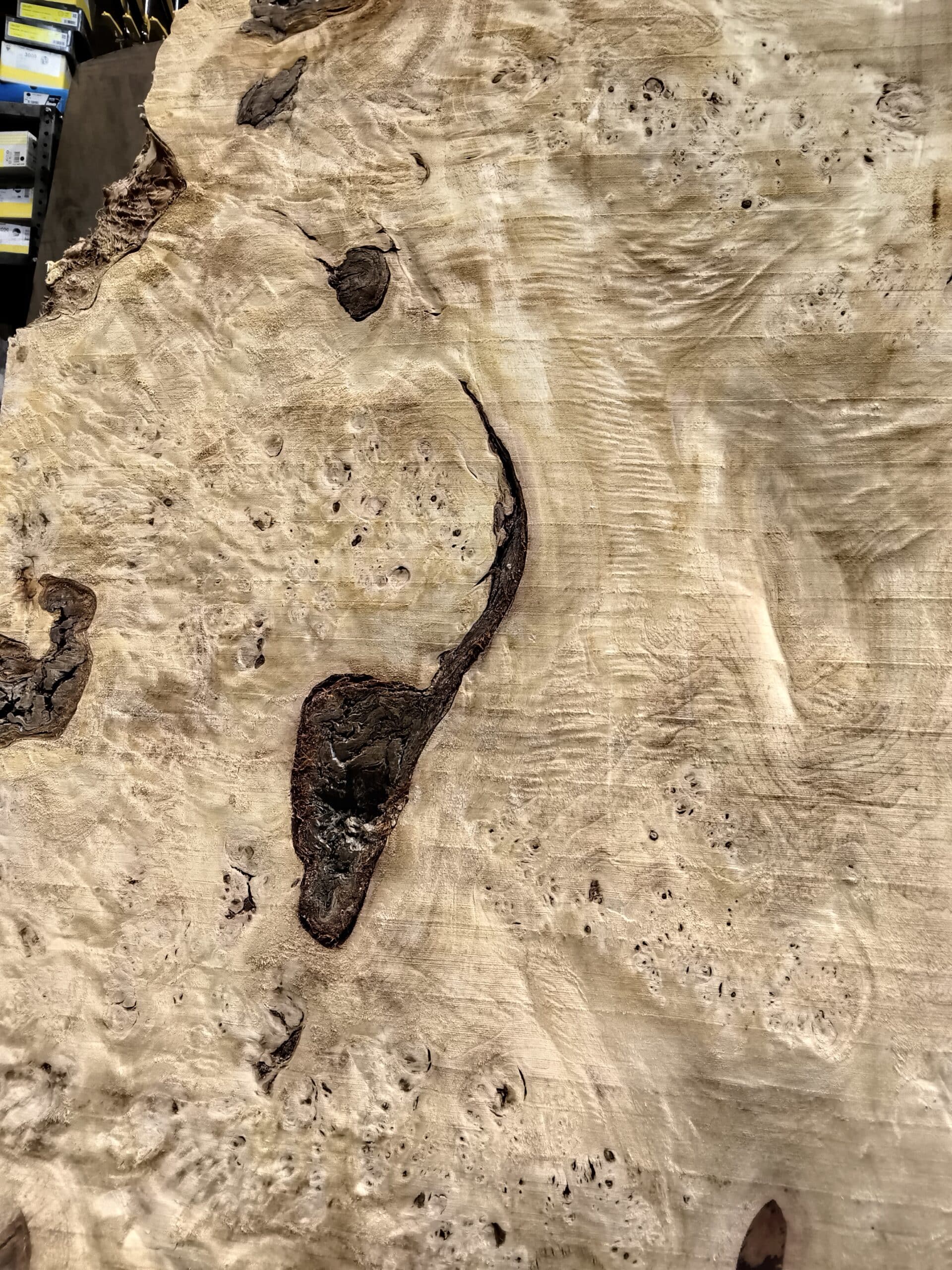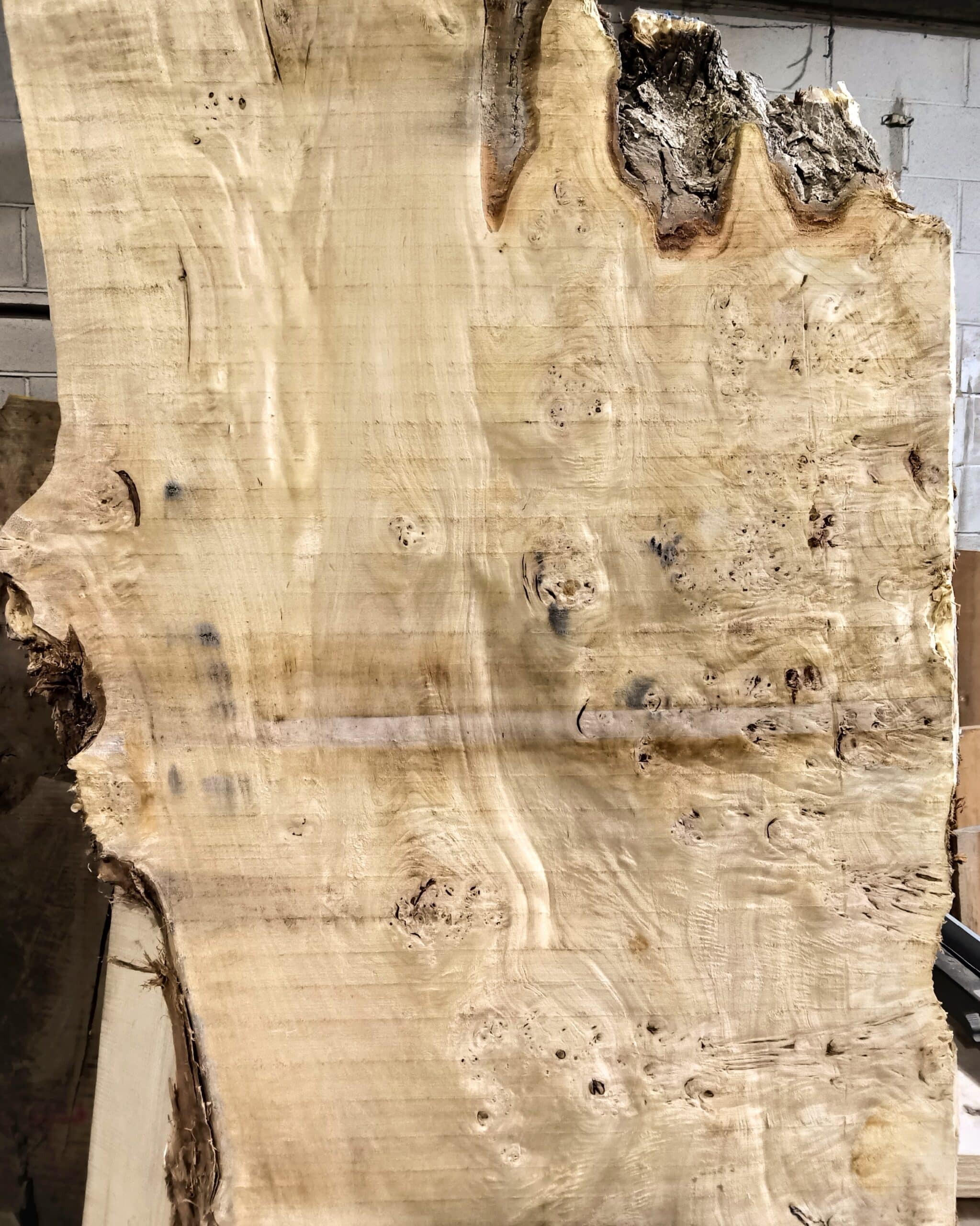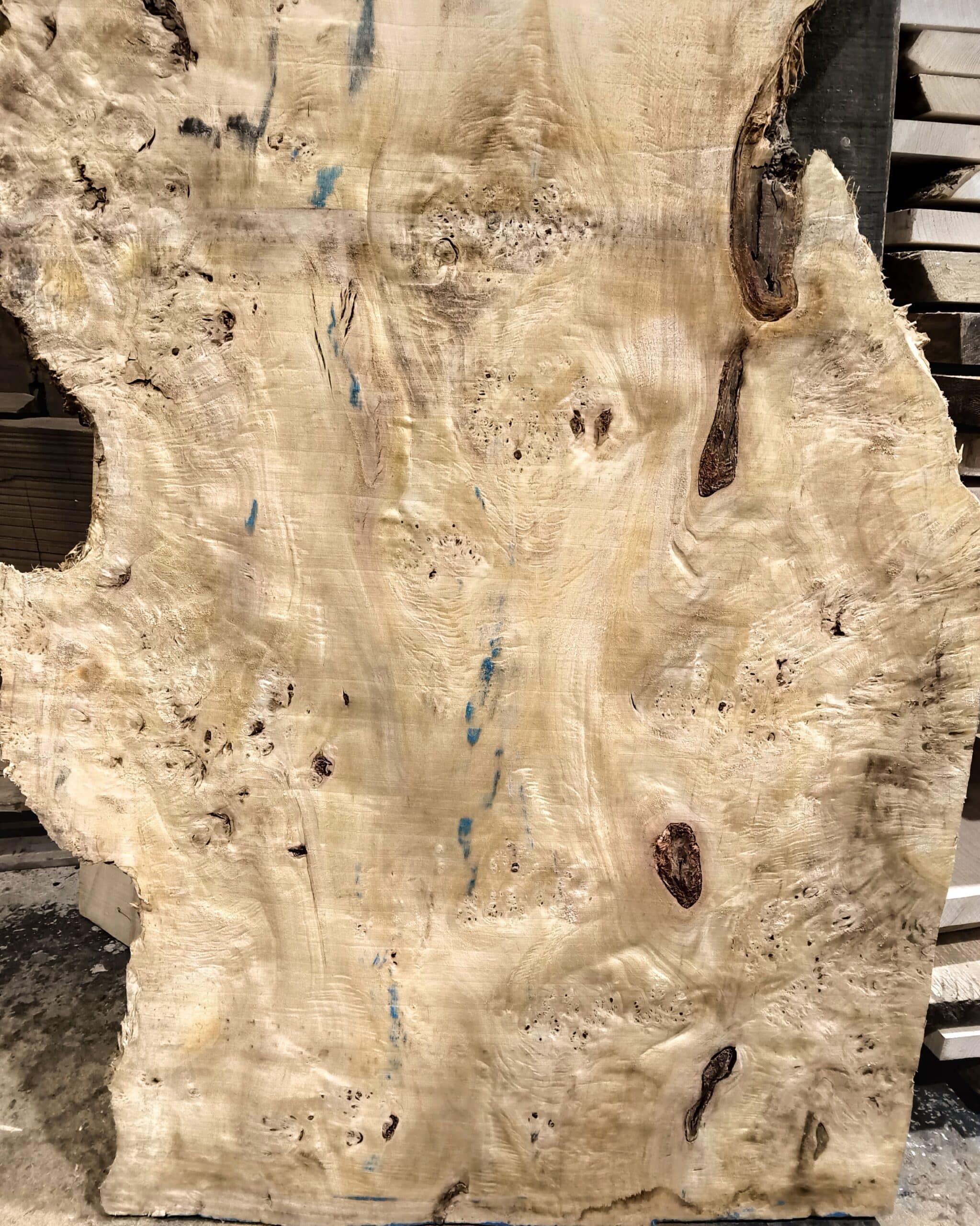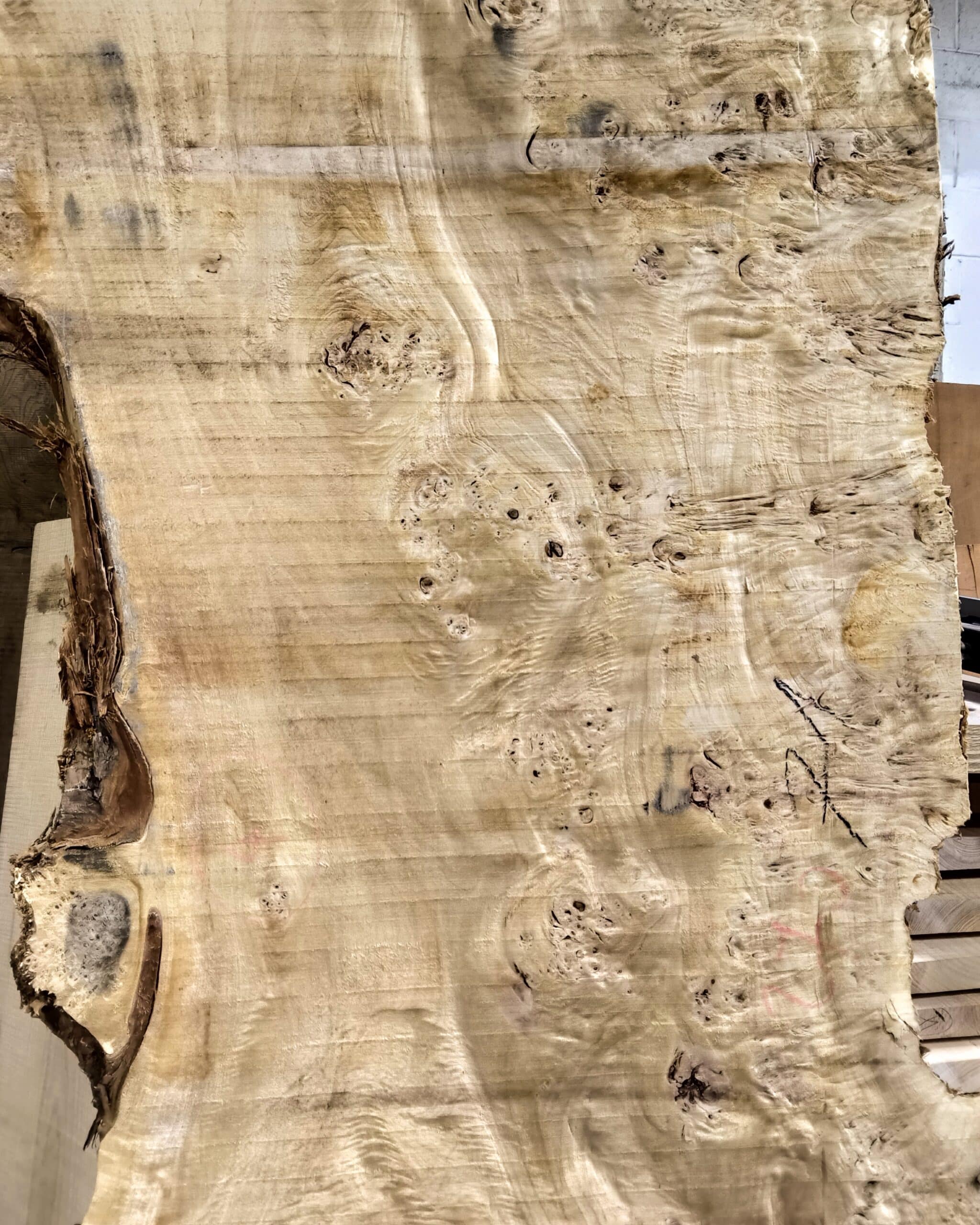 Huge Poplar Burl Slab with all the classic features, vivid flame, dark burl clusters and even some quilted areas. With great colouration and unique character throughout, Poplar Burl slabs of this quality and size are hard to find on UK soil. This slab features the classic dark burl eyes with creamy coloured heartwood and nice Ripple effect in places.